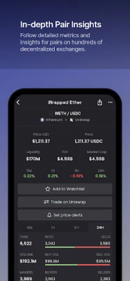 DEX Screener-এর মাধ্যমে ব্যবহারকারীরা অত্যাধুনিক ফিচার্সের সুবিধা পান। এখানে আপনি পাবেন লাইভ চার্ট এবং তাৎক্ষণিক লেনদেনের ডেটা, যা বাজারের প্রতিটি স্পন্দনকে আপনার নখদর্পণে নিয়ে আসে। সীমাহীন ওয়াচলিস্টের মাধ্যমে আপনার পছন্দের ডিজিটাল সম্পদগুলি ট্র্যাক করুন এবং সীমাহীন প্রাইস অ্যালার্ট সেট করে গুরুত্বপূর্ণ মূল্য পরিবর্তনের সঙ্গে সঙ্গে অবহিত হন। এছাড়াও, এর শক্তিশালী কাস্টমাইজেবল স্ক্রিনার বিভিন্ন মেট্রিক্স যেমন ভলিউম, মূল্য পরিবর্তন, লিকুইডিটি এবং মার্কেট ক্যাপ ব্যবহার করে আপনার জন্য উপযুক্ত বিনিয়োগের সুযোগ খুঁজে বের করতে সহায়তা করে।